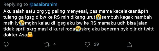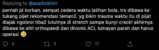 Utas dari dokter bedah tulang dr. Asa Ibrahim, Sp.OT melalui akun Twitternya @asaibrahim kembali viral. Kali ini ia mengisahkan tentang pasiennya yang memilih pengobatan alternatif dan berujung diamputasi. Utasnya sendiri sudah disukai oleh hampir tujuh ribu netter.