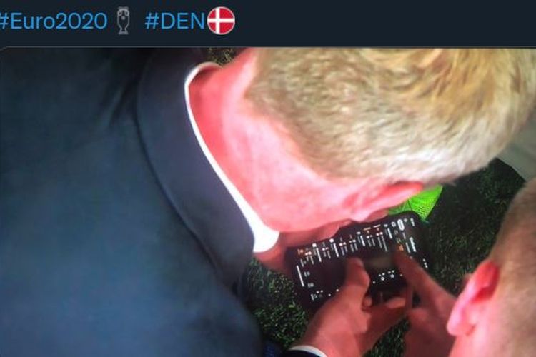 Momen saat anggota staf timnas Denmark mengecek kepastian mereka lolos ke fase gugur Euro 2020 setelah menekuk Rusia di Copenhagen, 21 Juni 2021. (TWITTER.COM/LIVESCORE)BOLASPORT.COM - Sempat terancam tak lolos ke babak 16 besar Euro 2020, staf pelatih dan pemain timnas Denmark tepergok ikut ngecek hasil akhir partai lain dan klasemen dari aplikasi LiveScore.