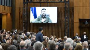Foto ilustrasi. Presiden Ukraina Volodymyr Zelensky saat menghadiri pertemuan dengan parlemen Kanada melalui konferensi video di Ottawa, Selasa (15/3/2022). Zelensky menyebut Ukraina sudah memahami bahwa mereka tidak akan bisa menjadi anggota NATO. (Sumber: Adrian Wyld/The Canadian Press via Associated Press)