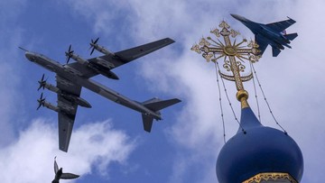 Foto: Sebuah pesawat tempur Sukhoi Su-35S Rusia dan pembom strategis Tu-95ms terbang dalam formasi di atas sebuah gereja selama latihan untuk flypast, yang merupakan bagian dari parade militer yang menandai peringatan kemenangan atas Nazi Jerman dalam Perang Dunia Kedua, di Moskow, Rusia, Rabu (4/5/2022). (REUTERS/Maxim Shemetov)