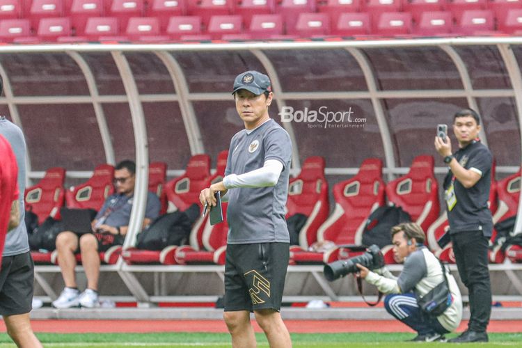 Pelatih timnas Indonesia, Shin Tae-yong, sedang memantau para pemainnya berlatih di Stadion Gelora Bung Karno, Senayan, Jakarta, 28 Desember 2022. (MUHAMMAD ALIF AZIZ MARDIANSYAH/BOLASPORT.COM)