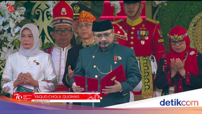 Menteri Agama (Menag) Yaqut Cholil Qoumas memimpin doa pada upacara HUT RI ke-79 di Ibu Kota Negara (IKN) Nusantara. Yaqut berdoa agar para pemimpin dihindarkan dengan nafsu yang dijajah.