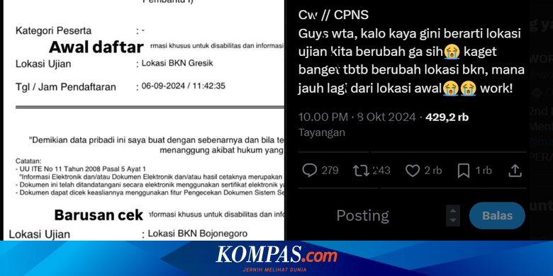 Dalam cuitan tersebut, tampak lokasi ujian saat pendaftaran bertuliskan "Lokasi BKN Gresik". Namun saat ini, lokasinya berubah menjadi "Lokasi BKN Bojonegoro".