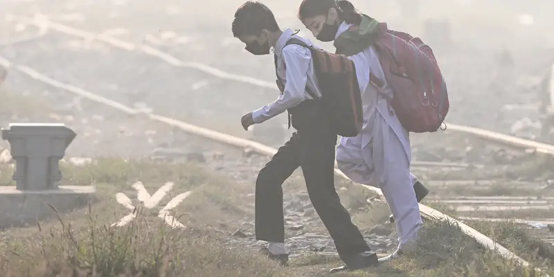 Anak-anak sekolah mengenakan masker berjalan melintasi rel kereta api di tengah kabut asap tebal di Lahore, Pakistan pada Rabu 20 November 2024. (Arif ALI/AFP)