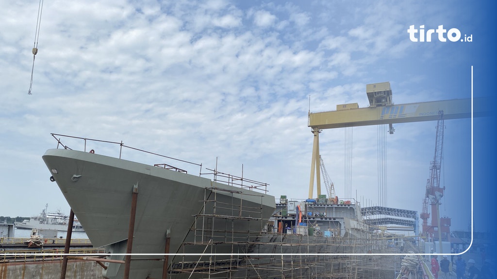 tirto.id - Siang terik menyelimuti pelataran Dock Semarang PT PAL Indonesia, Surabaya, Jawa Timur, tempat di mana proses produksi kapal perang, Fregat Merah Putih, digulirkan.