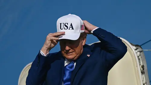 Presiden AS Donald Trump saat keluar dari Air Force One, yang mendarat di bandara Schiphol, Amsterdam, untuk menghadiri pertemuan puncak NATO di Den Haag, pada 24 Juni 2025. (Brendan Smialowski/AFP)... Selengkapnya
