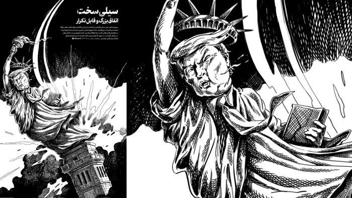 Karikatur tersebut menggambarkan Patung Liberty, yang merupakan simbol AS, dengan wajah Trump yang terkena "pukulan" dari serangan balasan Iran pada 23 Juni lalu.