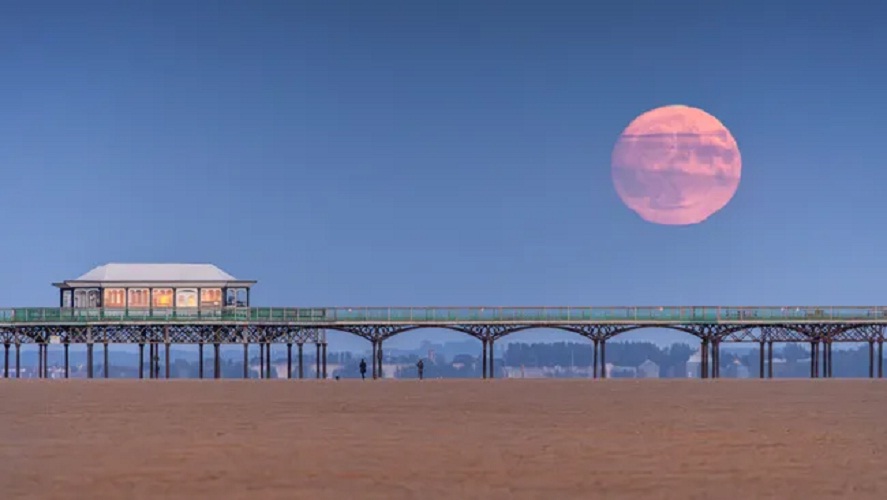 Ket. Bulan purnama Buck Moon tertangkap kamera sedang terbit di atas dermaga di Pantai St. Annes, Inggris.