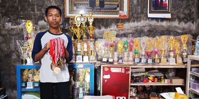 Lemari itu sesak oleh ratusan piala yang disusun rapi di dalam maupun di atasnya. Di ruangan yang sama, terdapat kasur dan meja kecil tempat Avan belajar.