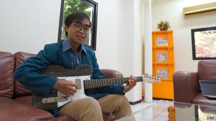 GITAR KARDUS - Mahasiswa Universitas Surabaya (Ubaya), Tristan Fawwaz Alvaro, menciptakan inovasi Duscaster berupa gitar listrik berbahan dasar kardus yang dipadatkan.