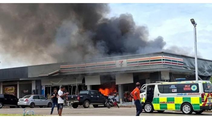 SERANGAN KAMBOJA - Asap terlihat di atas SPBU di Ban Phue, Thailand, pada hari Kamis, 24 Juli 2025, setelah Kamboja melancarkans serangan.