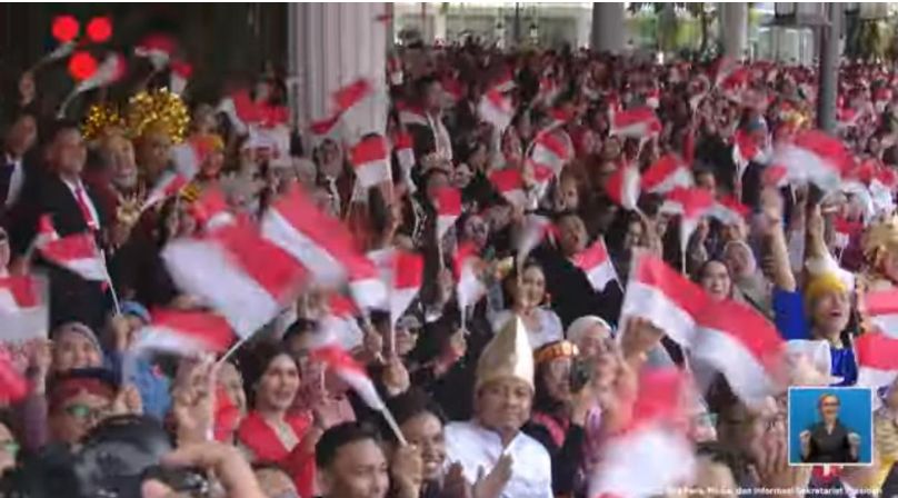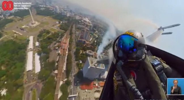 Sambil mengenakan kacamata hitam, Presiden menyaksikan beragam manuver dari pesawat tempur F16 di atas langit Istana Merdeka. Sambil memegang bendera Merah Putih berukuran kecil di tangan, Presiden Prabowo sesekali bertepuk tangan dengan aksi flypass.
