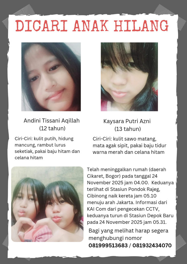 Kaysara Putri Azni (13 tahun) dan Andini Tissani Aqilla (12 tahun) kakak-beradik di Cibinong, Bogor, Jawa Barat, dilaporkan hilang oleh orang tuanya ke Polres Bogor. Terakhir keduanya terekam CCTV di Stasiun Depok Baru.