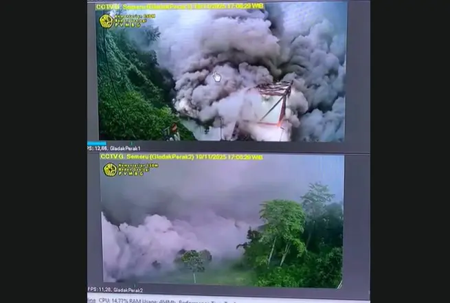 Awan panas guguran Gunung Semeru dilaporkan sudah meluncur hingga radius 14 kilometer dan menerjang Jembatan Gladak Perak di Kecamatan Candipuro, Kabupaten Lumajang, Rabu (19/11/2025) sore.