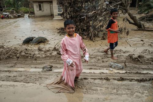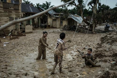 Banjir bandang ini disebut sebagai salah satu yang terbesar dalam beberapa dekade terakhir. Tampak dalam foto, anak-anak bermain di tanah berlumpur di Babo, Aceh Tamiang, pada Senin 15 Desember 2025. (Yasuyoshi CHIBA/AFP)